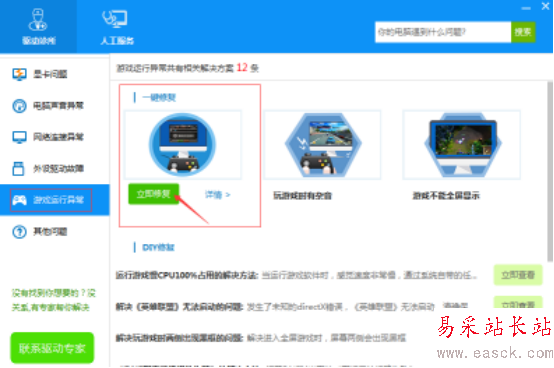 3、在驅(qū)動診所子界面中選取“游戲運行異常”選項,在一鍵修復(fù)中選擇你需要解決的問題,例如游戲過程雜音、無法全屏、游戲無法運行等。