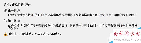 之后點選右側的“新建-虛擬機”,開始我們創建之旅了。在開始之前,系統會要求你為虛擬機起名字、分配內存等比較基礎的設置。但需要注意的是“指定代數”這一項目,一代是傳統Bios(安裝WindowsXP/7選擇此項)、二代則是針對UEFI Bios,要大家根據自己電腦的實際情況選擇: