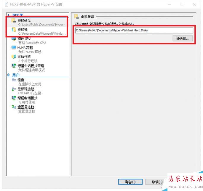 在第一次使用它制作屬于自己的虛擬機之前,小編建議大家先使用“Hpyer-V設置”對其首先進行設置。對一般用戶來說,可能需要更改的地方也就是“虛擬硬盤”和“虛擬機”文件存儲位置,它們默認都在系統盤下,如果你的系統盤并沒有像小編一樣留出充裕的空間,很容易一下子被填滿。