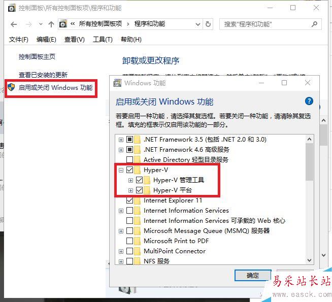說完了前提條件,開想要開啟它也很簡單,進入“控制面板-程序和功能”中,選擇“啟用或關閉Windows功能”后,勾選“Hyper-V”項目即可。