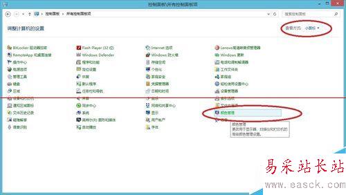 2、打開(kāi)控制面板,找到顏色管理,用小圖標(biāo)顯示,或者在右上角的搜索窗口中輸入顏色管理四個(gè)字也會(huì)自動(dòng)彈出來(lái),點(diǎn)擊進(jìn)入