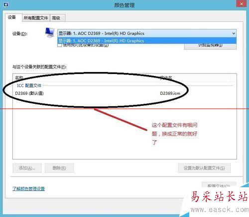 3、如下圖所示,選擇好顯示器,如果有幾個(gè)的話,可以看到下面的D2369.icm文件,就是他在搞鬼,替換成正常的就好了