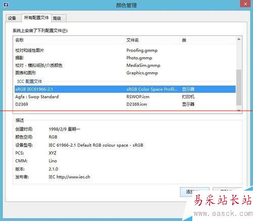 4、點(diǎn)擊所有配置文件,下拉找到ICC配置文件,選擇D2369.icm,刪除,再選擇Srgb這個(gè)文件,然后添加,確定即可