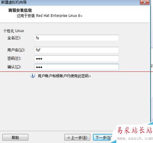 4、點擊下一步,會出現(xiàn)個性化的linux對話框,這個是你裝好系統(tǒng)之后的密碼和用戶名,得記住。
