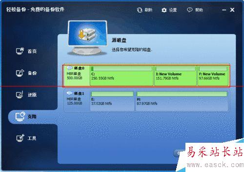 1、這里以“磁盤0”和“磁盤1”對拷為例。下載傲梅輕松備份:如下圖展示進入“克隆”單元選擇“磁盤克隆”。