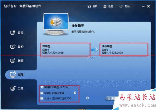 4、大小不一樣硬盤對拷時,注意下圖畫橫線選項:你可根據自己的情況做相應調整。之后點擊“開始克隆”