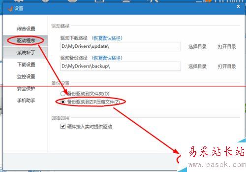 3、在【綜合設置】界面下,點擊選擇【驅動程序】-->【硬件接入時實時提供驅動】-->【確定】選項完成操作。(如圖所示)