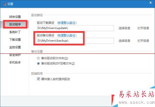 3、在打開的“設置”窗口中,切換到“驅動程序”選項卡,設置“驅動備份路徑”,點擊“確定”完成設置。之所以設置驅動備份路徑,是防止備份驅動程序的位置被系統所覆蓋。