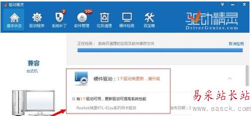 第一步:打開驅動精靈,然后點擊“一鍵體檢”,如果發現你的電腦有驅動需要更新,或者是沒有找到對應的網卡驅動的話,會有如下圖一樣的提示: