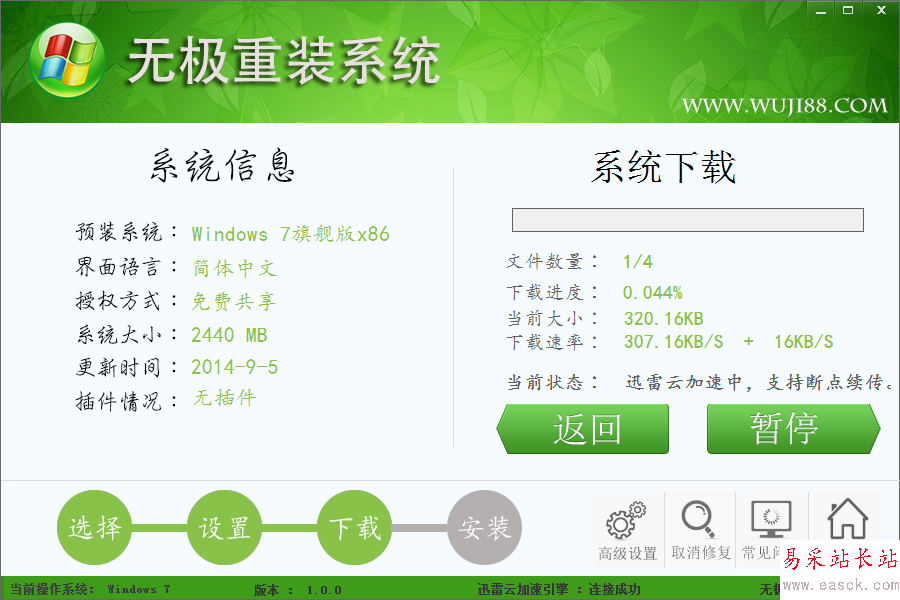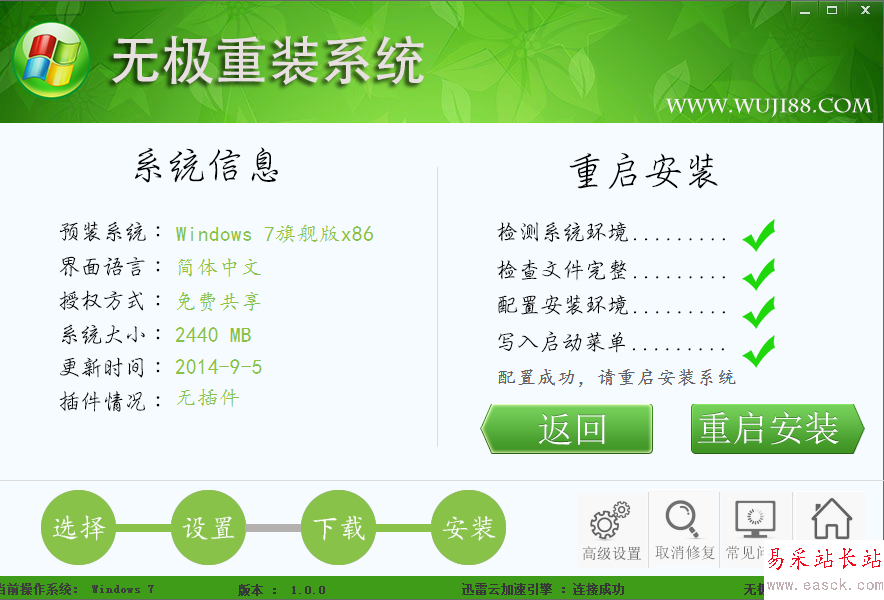 1.無極重裝系統(tǒng)速度取決于你的網(wǎng)速及電腦配置快慢和高低。