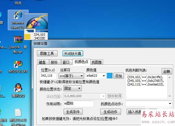 1.在[按鍵設(shè)置]中選[找顏色點(diǎn)]選項(xiàng)頁,打開[放大器],把鼠標(biāo)移動到桌面的IE圖標(biāo)上,然后按快捷鍵[F11],把IE圖標(biāo)的顏色點(diǎn)和坐標(biāo)位置加入顏色點(diǎn)列表中。這里取3-4個有代表的顏色點(diǎn)就可以了。接著關(guān)閉放大鏡,把在[作用說明:]輸入:ie圖標(biāo),點(diǎn)擊[生成條件],完成找色條件。