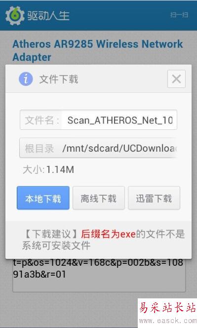 掃描完成,識別成功之后,會出現一個驅動人生網卡驅動的下載頁面,這個就是網卡驅動了。溫馨提示:建議在WIFI環境下下載該網卡驅動,否則運營商可能會收取相關費用。點擊下載,選擇根目錄,再點擊本地下載,就可以將網卡驅動安裝包下載到手機上了。