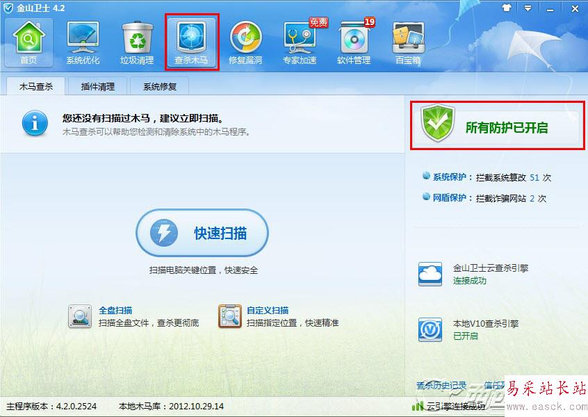 2、點擊“查殺木馬”選項,查看并點擊右側“所有防護已開啟”或“部分防護未開啟”位置;