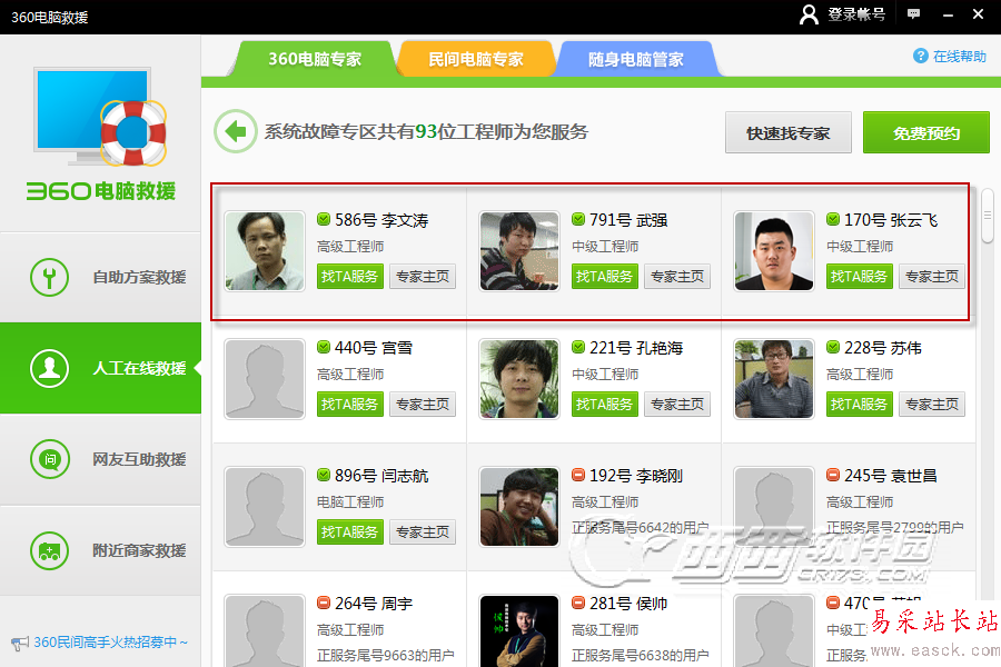 由于電腦經常藍屏,我選擇了系統故障!下面出現了,93位360電腦專家!您可以選擇其中的任一一位為您解決問題。
