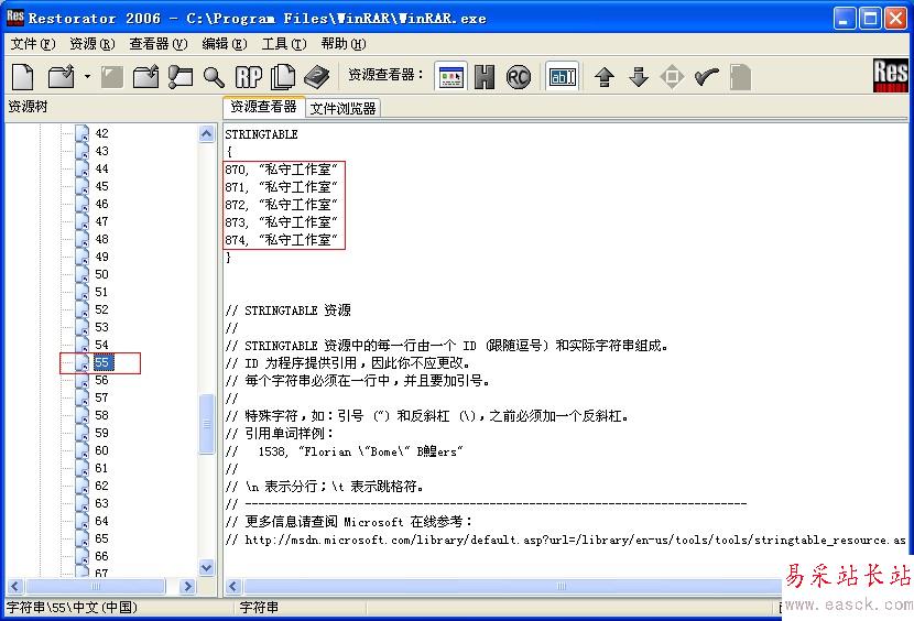 在字符串內 找到55 這個文件 把上面紅框里的內容修改。 注:" 在引號中的文件 "引號不可刪除。