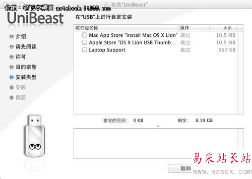 因為前面是用Mac App Store下載的安裝程序,可以勾選第一項“Mac App Store“Install Mac OS X Lion””前面的方塊來制作臺式電腦安裝盤;第二項可以在使用原裝USB啟動盤時勾選;勾選第三項后可以啟動筆記本。