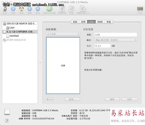 我們日常在Windows下用的U盤多數是FAT32或者NTFS格式,制作黑蘋果系統安裝盤,需要先將它格式化成對應的格式。先打開蘋果電腦“應用程序”中的“磁盤工具”,左側選擇U盤,右側點選“分區”,格式選擇“Mac OS擴展(日志式)”,將u盤格式化成1個分區。