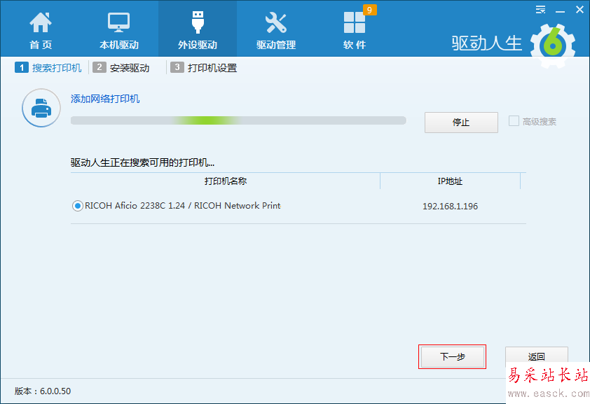 第一步,搜索打印機(jī),搜索局域網(wǎng)內(nèi)的打印機(jī)設(shè)備。只要打印機(jī)在局域網(wǎng)內(nèi),驅(qū)動(dòng)人生就可以搜索到打印機(jī)設(shè)備的名稱。搜索到打印機(jī)后,點(diǎn)擊下一步。