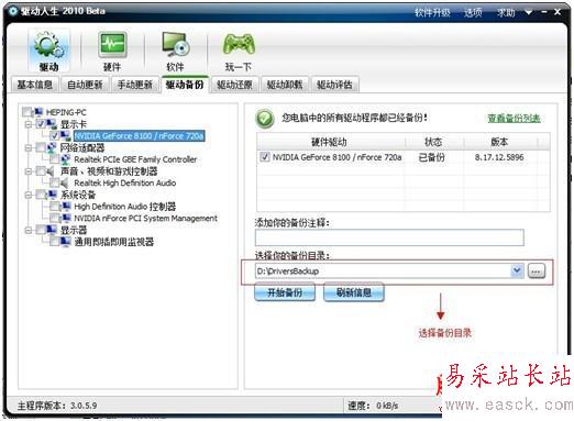 驅動人生為我們選擇最佳的驅動備份目錄,驅動會默認備份到D盤DriversBackup,你可以通過驅動人生上的選擇備份目錄后面的按鈕備份目錄,也可以通過驅動人生的選項設置,設置你認為最佳的驅動備份目錄