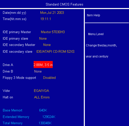 2、按“↓”鍵到“Drive A”項,按“PageDown”鍵選擇"2.88M,3.5 in".