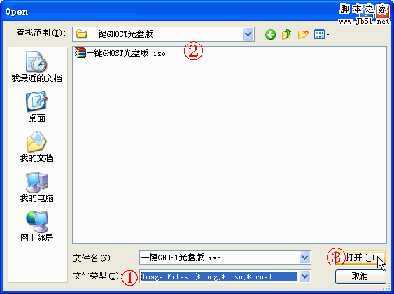 2、選擇"文件類型"為"圖像文件(*.nrg,*.iso,*.cue)" -> 找到"一鍵GHOST光盤版.ISO"->"打開"