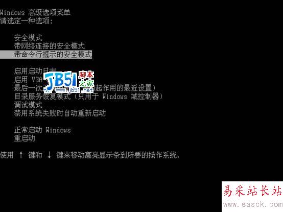 1、重新啟動計算機,按住F8鍵,在“Windows 高級選項菜單”中選擇“帶命令行提示的安全模式”,并回車。