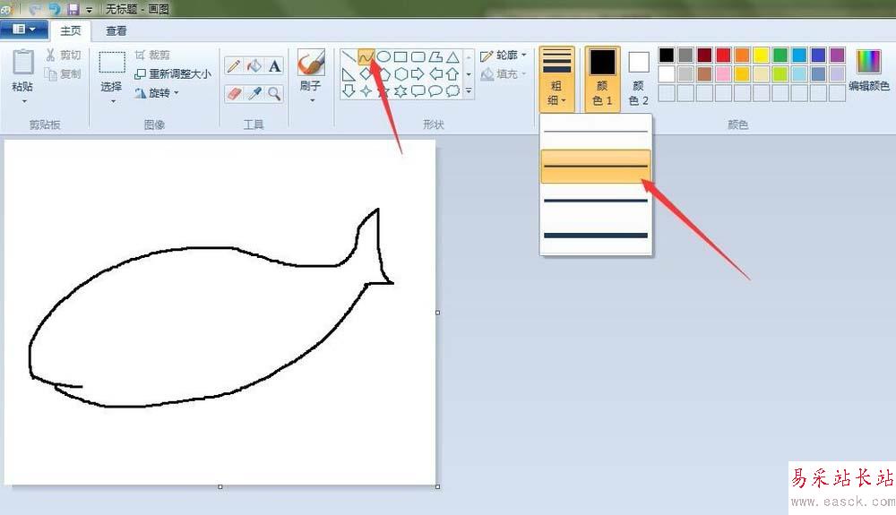 3、鰭:點擊“曲線”按鈕,線條粗細(第二個),在適當位置上畫上一對鰭。
