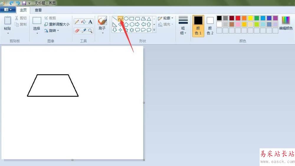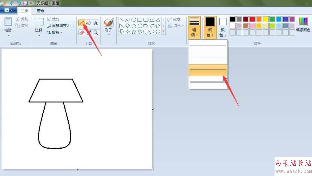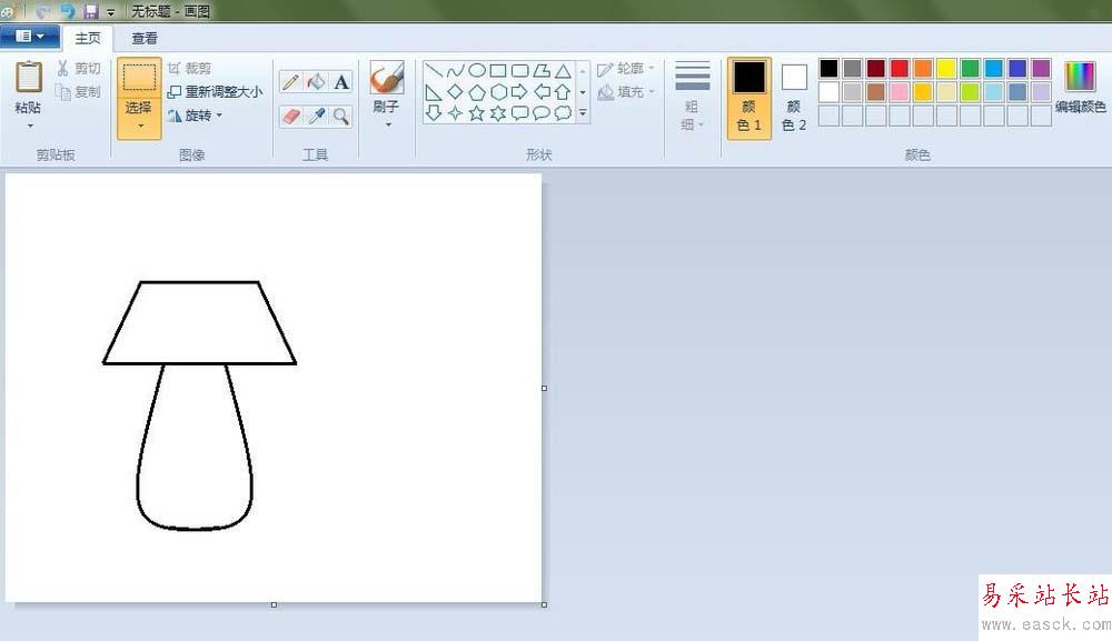 2、燈罩:點擊“直形”按鈕,線條粗細(第二個),先在“畫紙”適當位置上畫一個梯形作為燈罩。