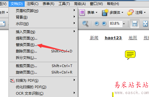 3、點擊了文檔的菜單之后,彈出了下拉菜單選中為 替換頁面 的選項。