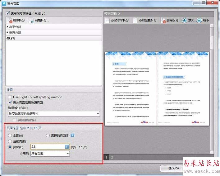 5、最后在設置選項中可以選擇保留拆分的源頁面或者是刪除源頁面。設置完成后點確認,頁面就拆分成功了。
