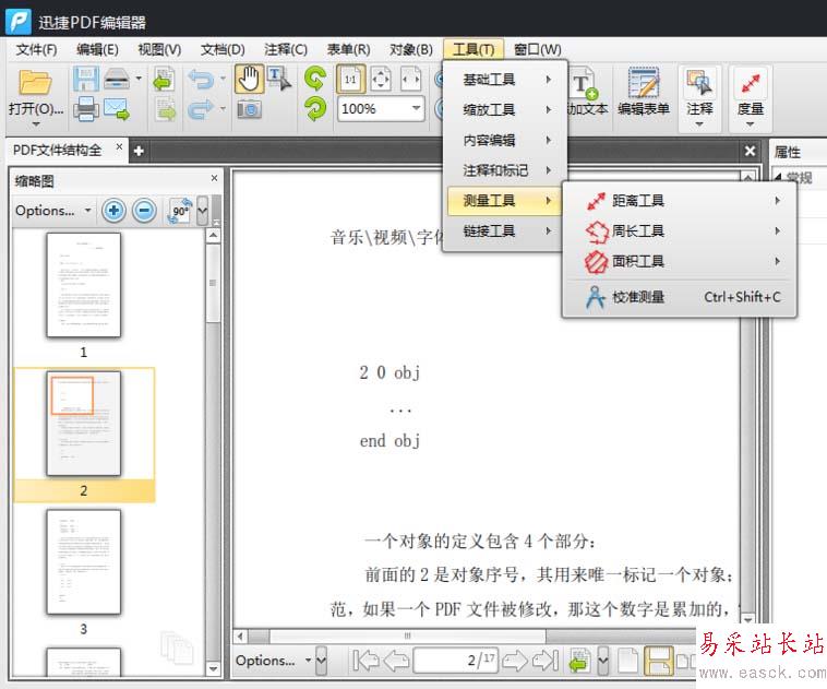 2、我們可以在PDF編輯器中的菜單項找到工具菜單,在工具下拉菜單中選擇測量工具,選擇距離工具