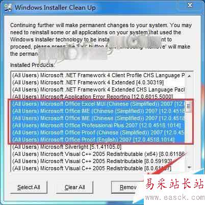 9、在Windows Install Clean Up的軟件產(chǎn)品列表中找到跟Office 有關的項,全部選中后,點擊Remove.經(jīng)過一段時間的清理操作,再次重復第1步的打開安裝程序,安裝過程順利完成了.