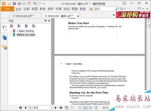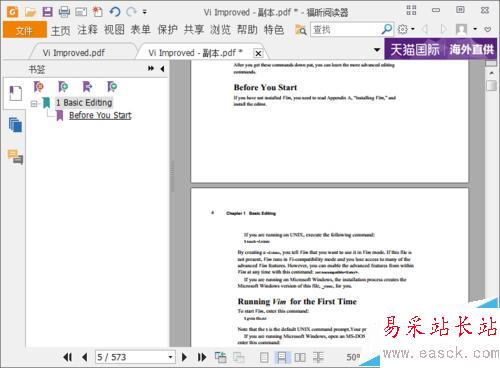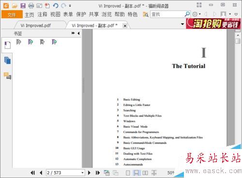 2、下載并安裝好福昕閱讀器,然后用它打開(kāi)需要添加目錄的PDF文檔。其實(shí)目錄的制作就是給PDF文檔添加一系列的閱讀標(biāo)簽。打開(kāi)文檔后可以看到最左邊有三個(gè)圖標(biāo),分別是標(biāo)簽,縮略圖和注釋。