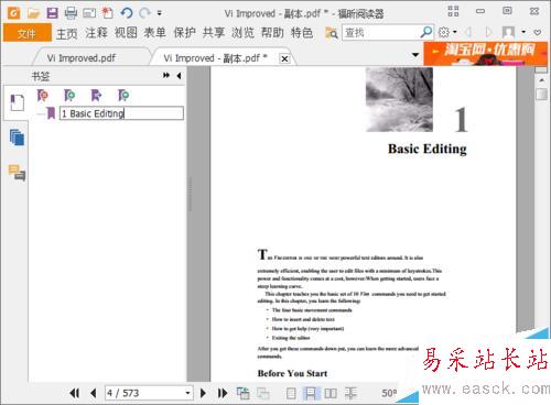 6、添加目錄就是添加一個(gè)個(gè)的標(biāo)簽,要一個(gè)一個(gè)添加,要有點(diǎn)耐心。要在書(shū)籍哪個(gè)位置添加標(biāo)簽,就將文檔內(nèi)容置于相應(yīng)的位置,比如我添加的第一個(gè)標(biāo)簽是1,Basic Editing,那么我將頁(yè)面置于此,然后點(diǎn)擊左面“添加標(biāo)簽”按鈕,然后就可以對(duì)標(biāo)簽名字進(jìn)行編輯。我的第一個(gè)標(biāo)簽添加成功啦。