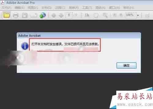 3、此時Adobe Acrobat軟件提示"本文檔時發生錯誤 文件已損壞并且無法修復"