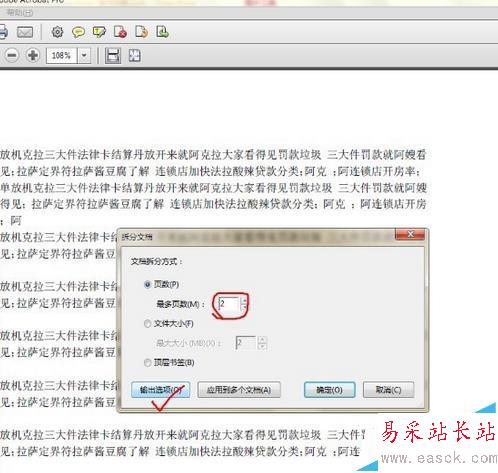 4、在彈出的對話框中選擇最大頁數為2頁,也就是每2頁進行拆分,如果為偶數頁,那么正好拆分,如果為奇數的話,最后保留1頁,單擊輸出選項,按鈕,如下圖所示: