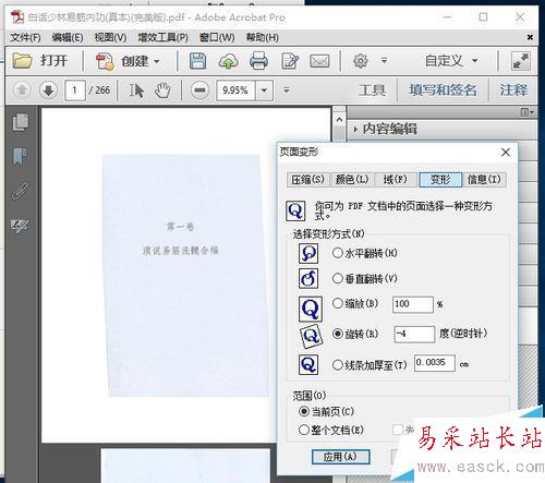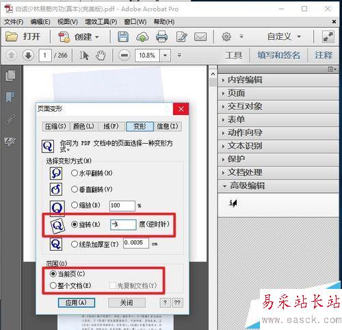 7、點(diǎn)擊變形,輸入調(diào)整角度可以是小數(shù),注意上面是逆時(shí)針為正,如果是順時(shí)針調(diào)整就在數(shù)值前添個(gè)減號(hào),然后再在下面選擇是調(diào)整當(dāng)前頁(yè)還是批量全部頁(yè)面。
