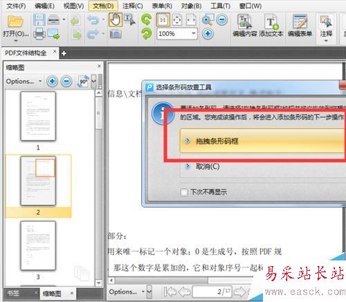 3、點(diǎn)擊完添加條碼后,會彈出選擇條形碼放置工具界面。鼠標(biāo)左鍵點(diǎn)擊“拖拽條形碼框”的選項(xiàng)。