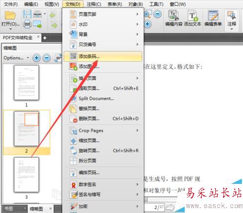 2、在打開的PDF編輯軟件中,我們點(diǎn)擊菜單欄中的文檔下拉菜單,從中選擇添加條碼的選項(xiàng)。如圖所示: