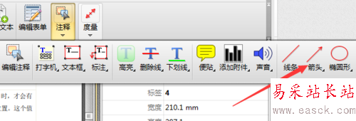 2、點擊PDF文件編輯器中工具欄中的注釋工具,在注釋工具下拉菜單中選擇箭頭工具,鼠標左鍵點擊箭頭工具。如圖所示: