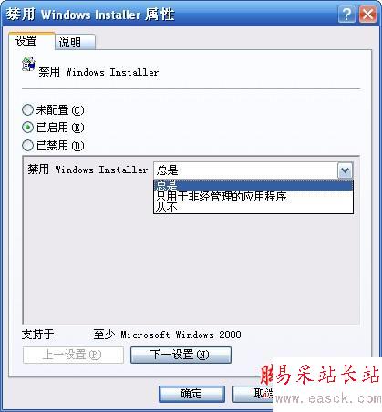windows開始菜單,運行里面輸入gpedit.msc打開組策略,在“計算機配置”→管理模板→windows組件→windows installer,右邊 第一項就是禁用windows installer。把它改成 “未配置”后者“已禁用”就可以了。