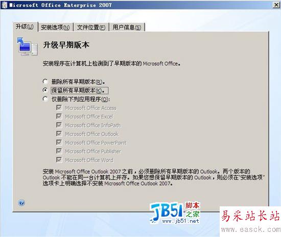 另外,還有一部分人只是想安裝office2007來(lái)玩玩,工作中還是用office2003。這也沒關(guān)系,微軟對(duì)office安裝的改進(jìn)可以讓office2007和office2003并存在一個(gè)系統(tǒng)中。運(yùn)行office2007的安裝,選擇“自定義”安裝,安裝程序會(huì)自動(dòng)掃描到系統(tǒng)中已經(jīng)安裝的office程序,并提示3種升級(jí)安裝方式,選擇“保留所有早期版本”,(圖2)
