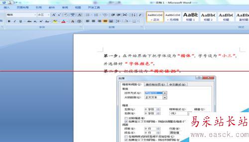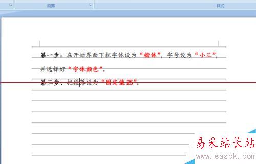 5、打開word2007,新建一個空白文檔。在開始界面下把字體設為楷體,字號設為小三號,選擇好自己喜歡的字體顏色。把文檔段落設為。固定值=25