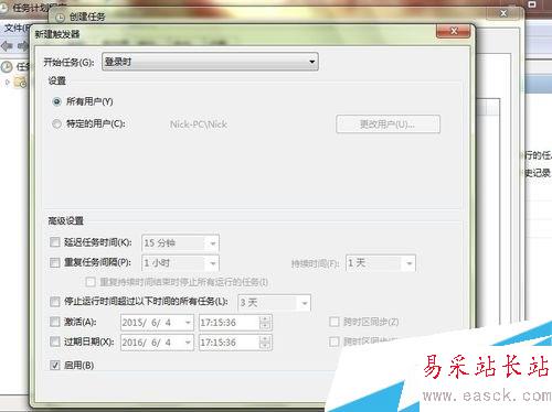 3:切換到觸發器,點“新建...”,開始任務設置為:“登錄時”確定;