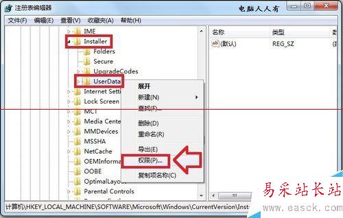 3、依次打開:HKEY_LOCAL_MACHINE/SOFTWARE/Microsoft/Windows/CurrentVersion/Installer/UserData,然后右鍵點擊UserData▶權限