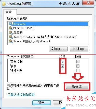 8、點擊允許下的完全控制和讀取選項(務必選中對勾)▶確定,再點擊底下的高級進行設置。
