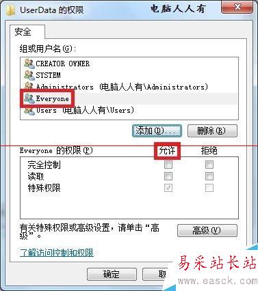 10、以同樣的方法添加Everyone(每個人)賬戶授權。