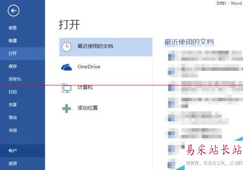 4、安裝完成后,打開office任一組件,如下圖所示,小編打開的是word2013,選擇左上角的<文件>,在樹形菜單中選擇<賬戶>