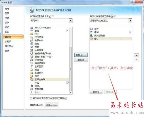 當然,這里office默認列出了相對常用的命令,如果功能按鈕原本是在“審閱”選項卡中,這里切換到“審閱選項卡”即可。