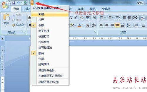 1、打開word程序,點擊“自定義快速工具欄”按鈕,如圖:
